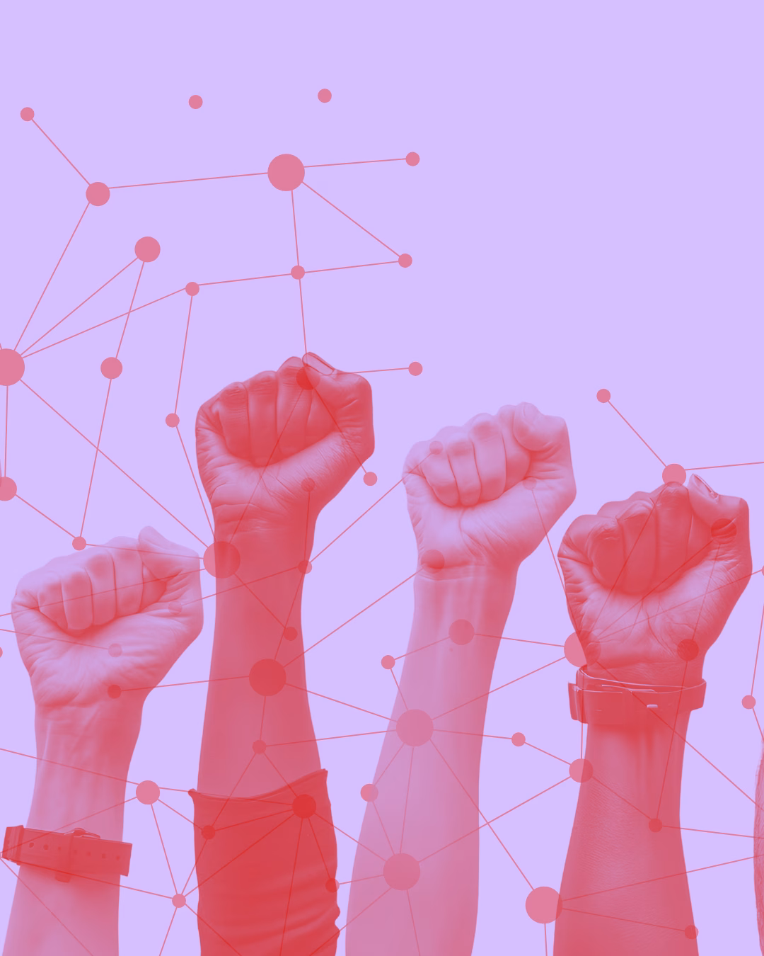 Menschen mit Gewerkschaftswesten bei einer Demonstration von hinten. In pink/rot eingefärbtTeil des Projekts: Wann treffen wir uns?